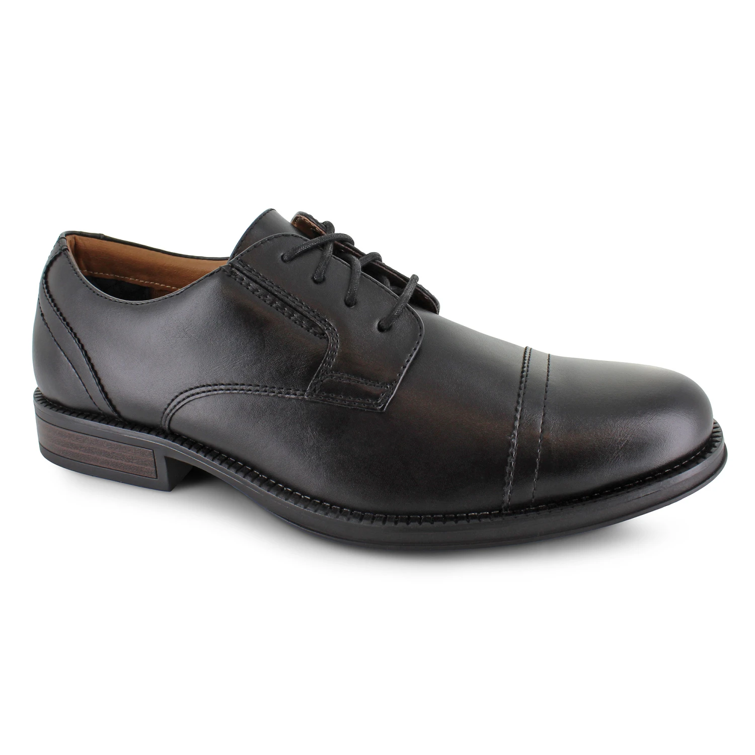 Dress to impress when you lace up with the Dockers Garfield. Crafted with a synthetic leather upper to create a handsome cap-toe design, this oxford is sure to turn heads with simplistic classic appeal. The molded and cushioned insole ensures superior comfort where you need it most that will carry you through even the longest days. The overall lightweight design will keep a bounce in your step when paired with a durable yet lightweight synthetic outsole.