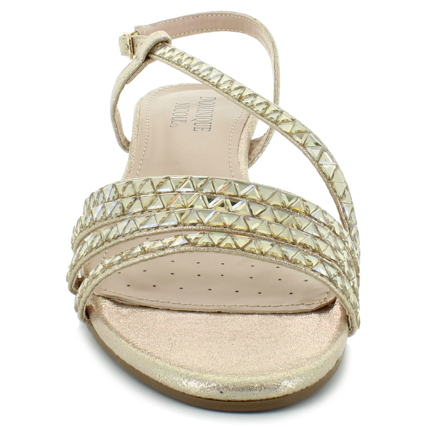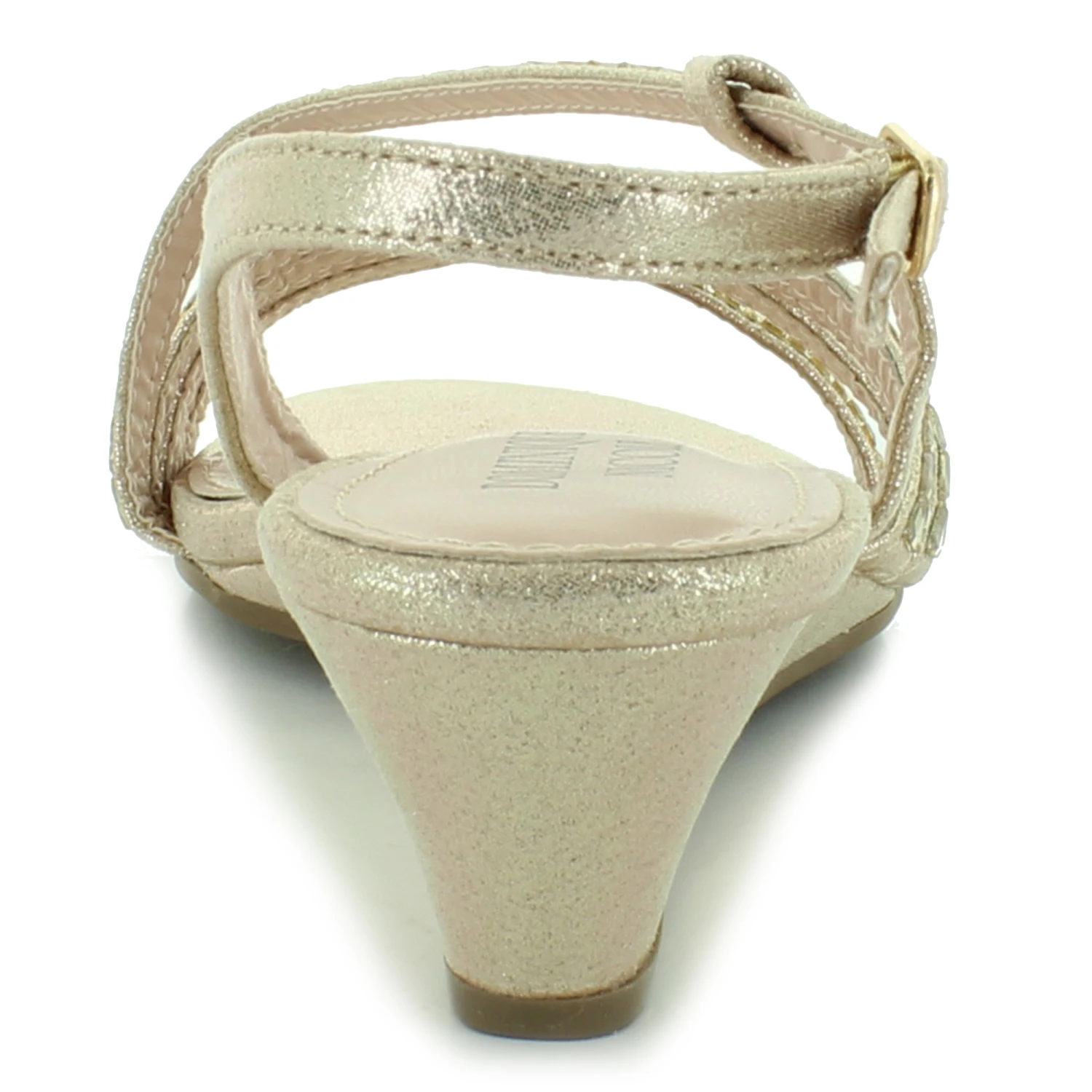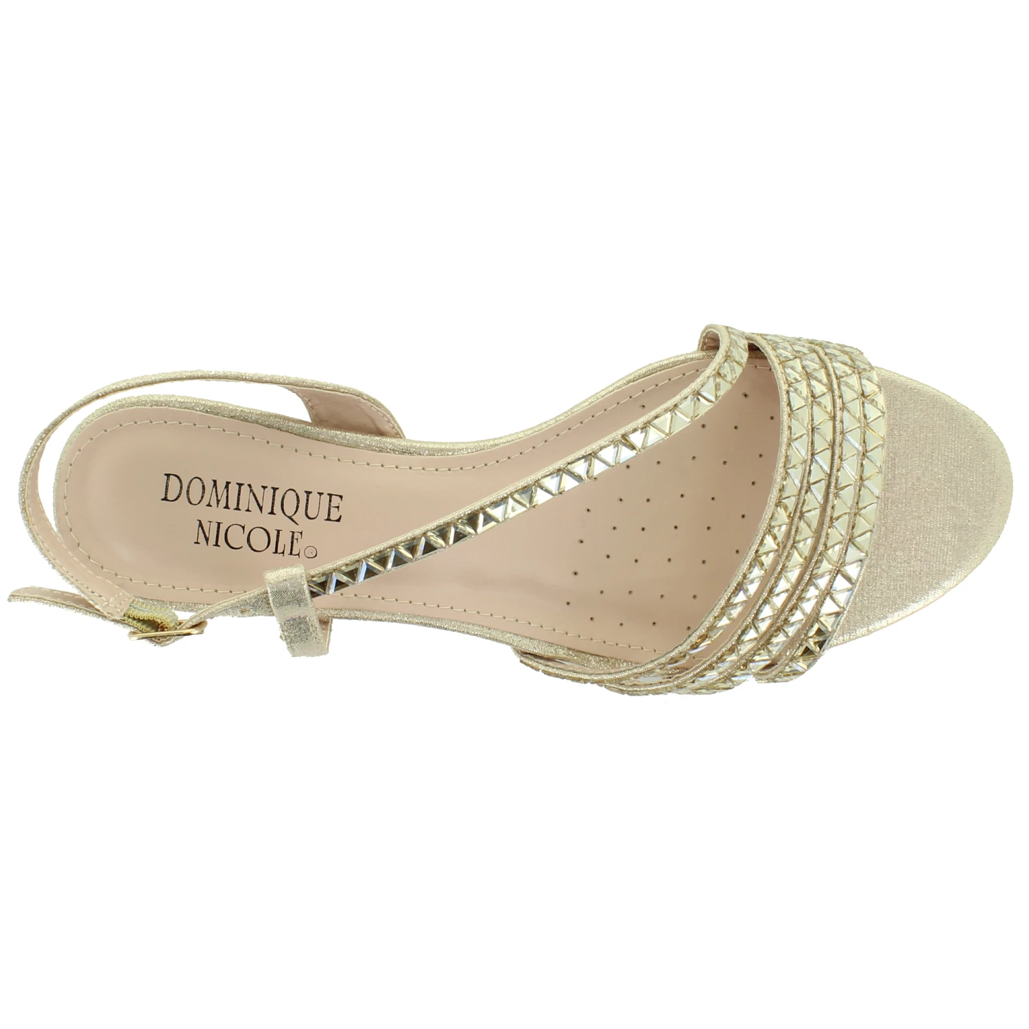 Fashionable wedge dress shoe by Dominique Nicole. This stylish pair features a rhinestone upper with a side buckle closure. The wedge heel will provide just the right height.