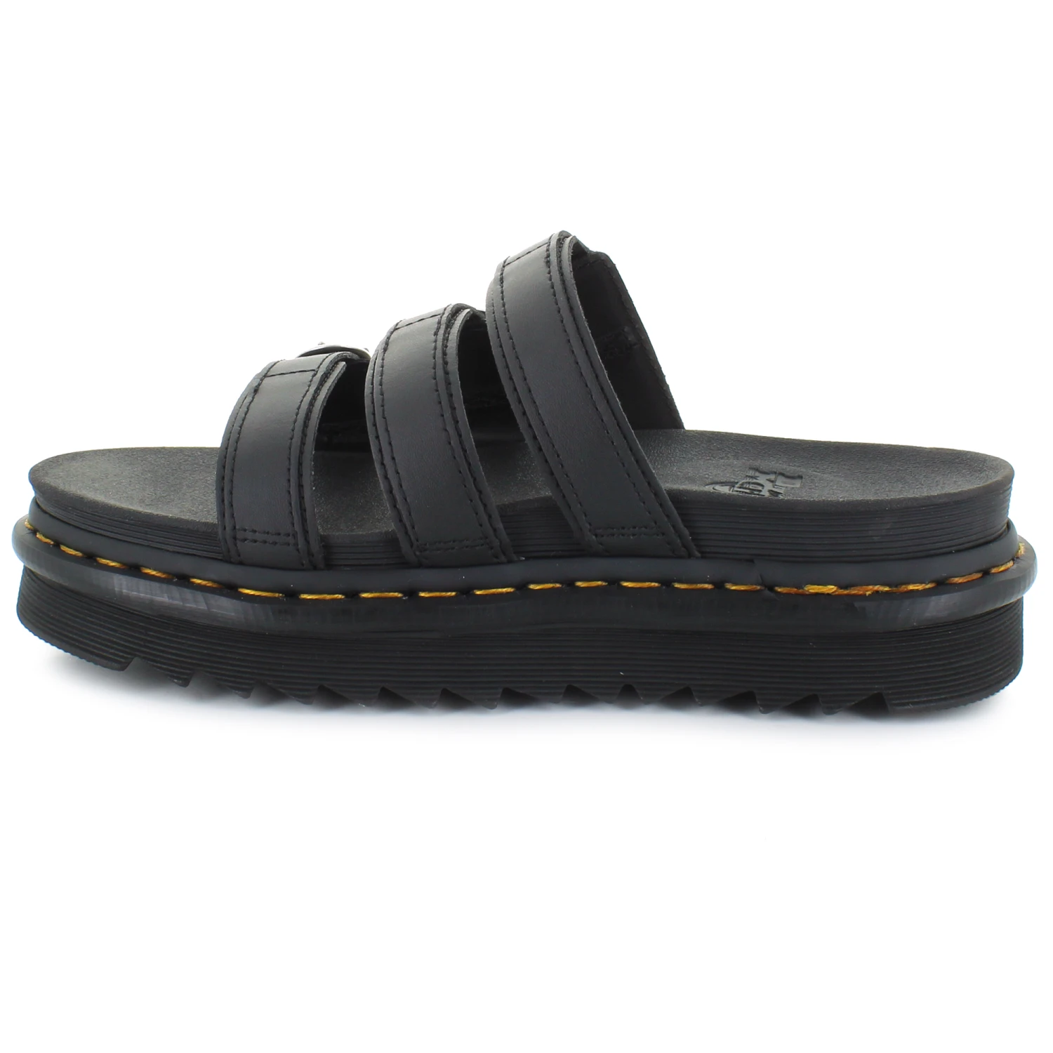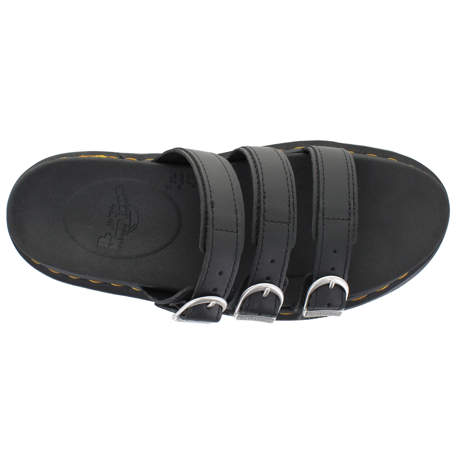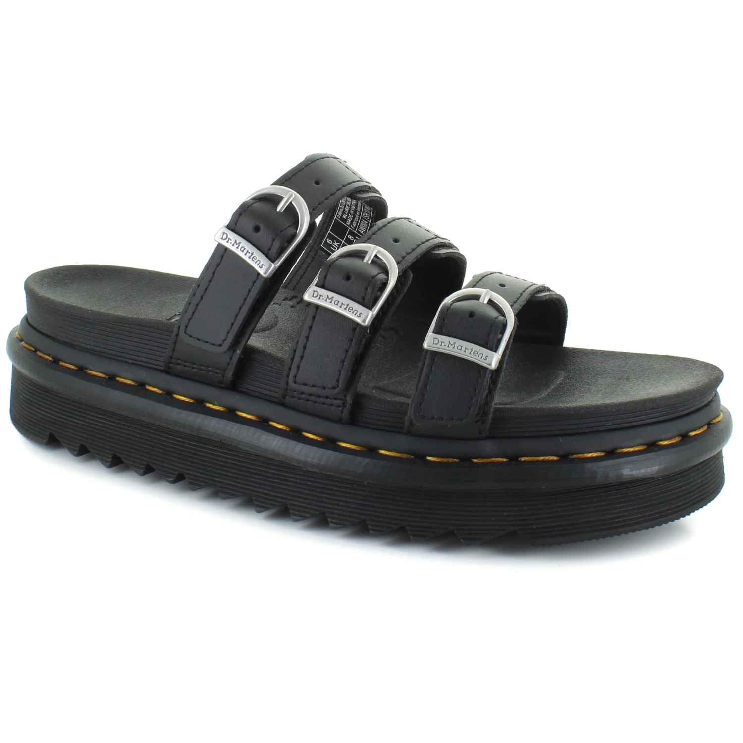 The Blaire Leather Slide – a Docs take on a laidback slide. Decked out with branded horseshoe buckles in a bold 3-strap design, the sandals are built on a super light, blown EVA sole and welted with yellow stitching.