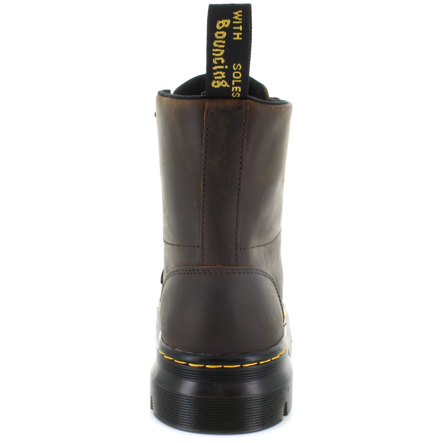 Classic rugged leather boots by Dr. Martens. This boot features durable metal eyelets with stitching details.
