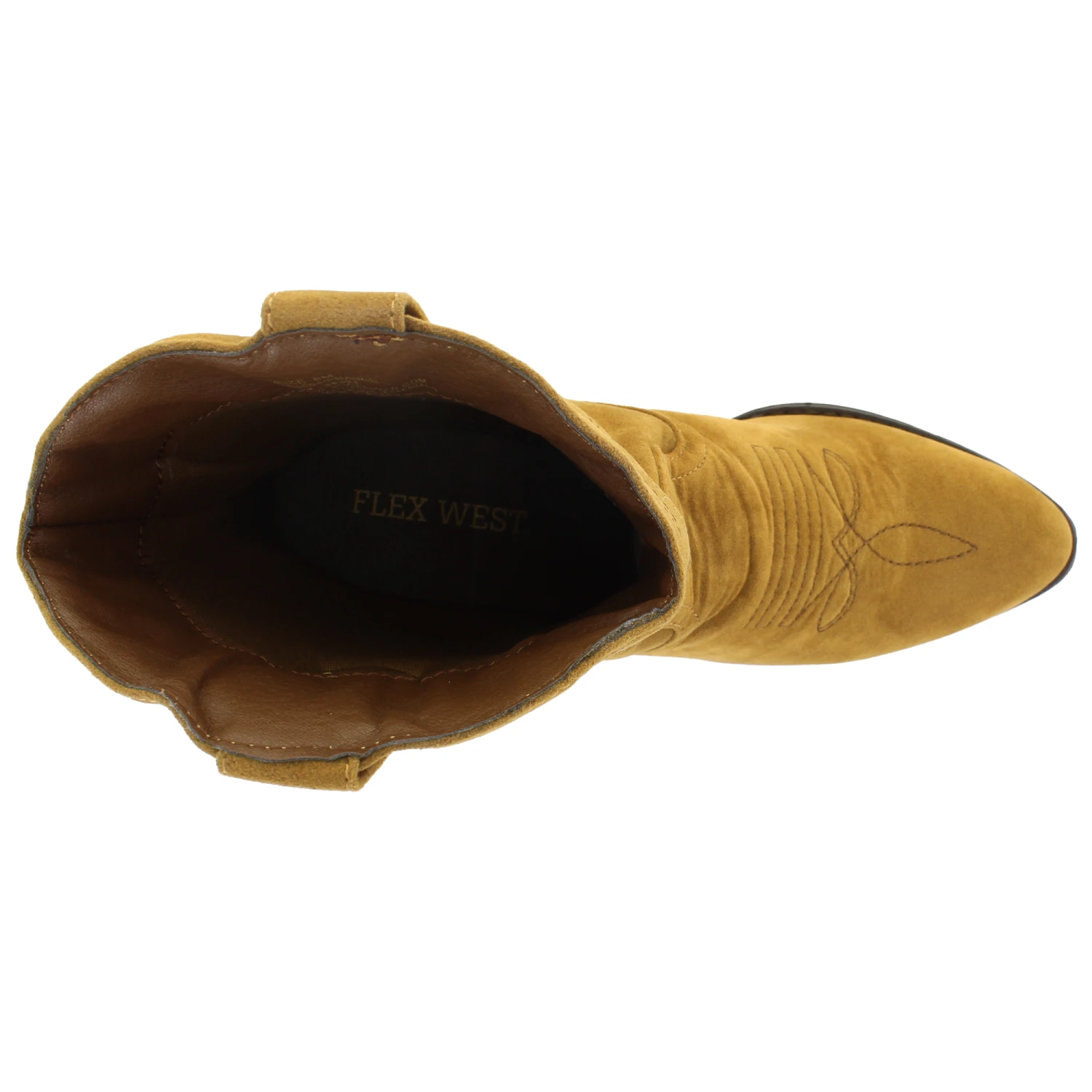 Dress up in fashionable style with the Flex West Prairie. This cute western boot features a slip-on wear with dual pull-tabs for an easy on and off. The classic western stitching detail provides additional style.