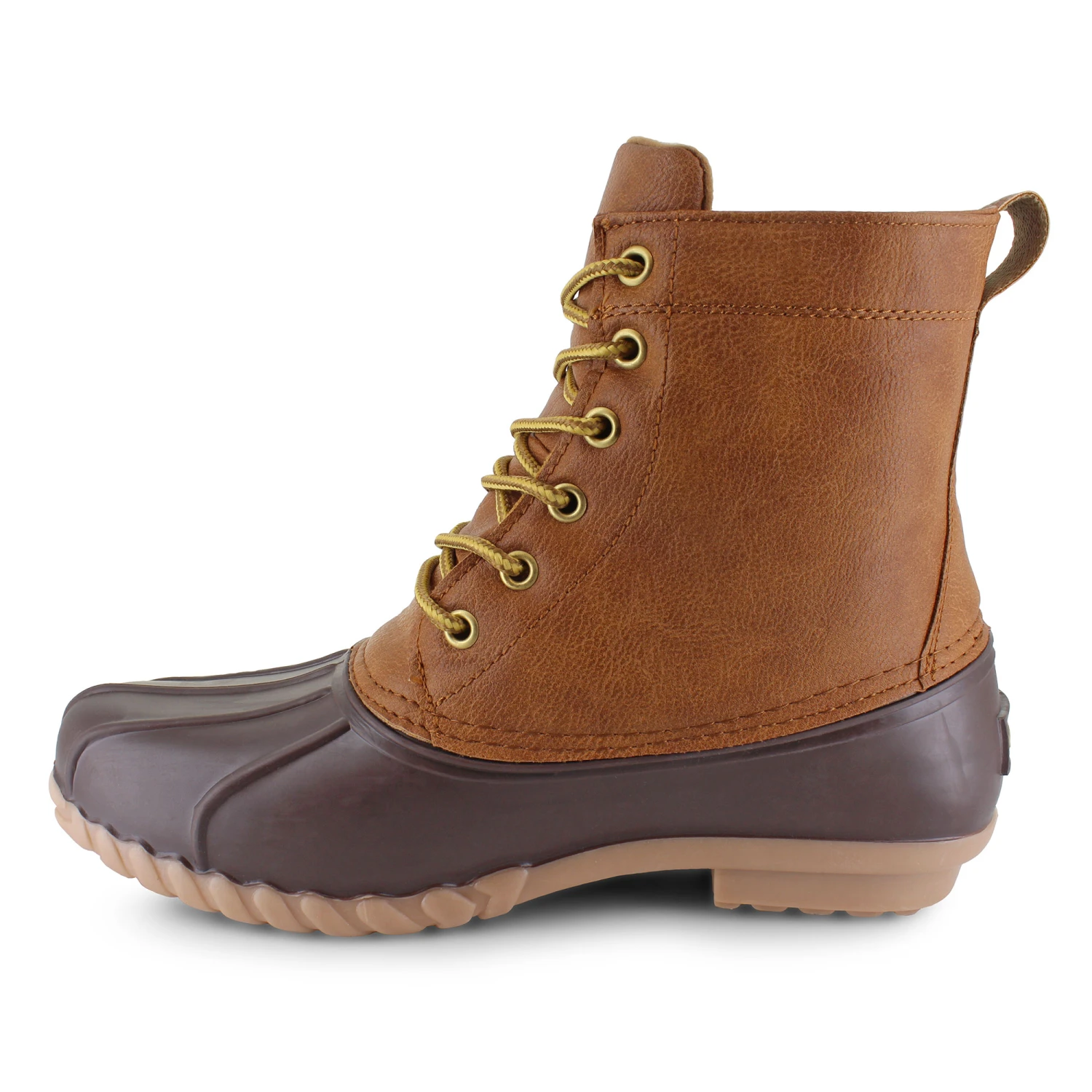 Ensure your feet are protected from the elements this season when you gear up with the London Fog Seth Runner. This handsome duck boot is crafted with a durable synthetic leather upper with a waterproof rubber shell bottom to ensure your feet stay cozy and dry. The lace-up front closure combined with a padded collar and tongue offers additional ankle support. A lugged rubber outsole provides multi-surface traction rain or shine.