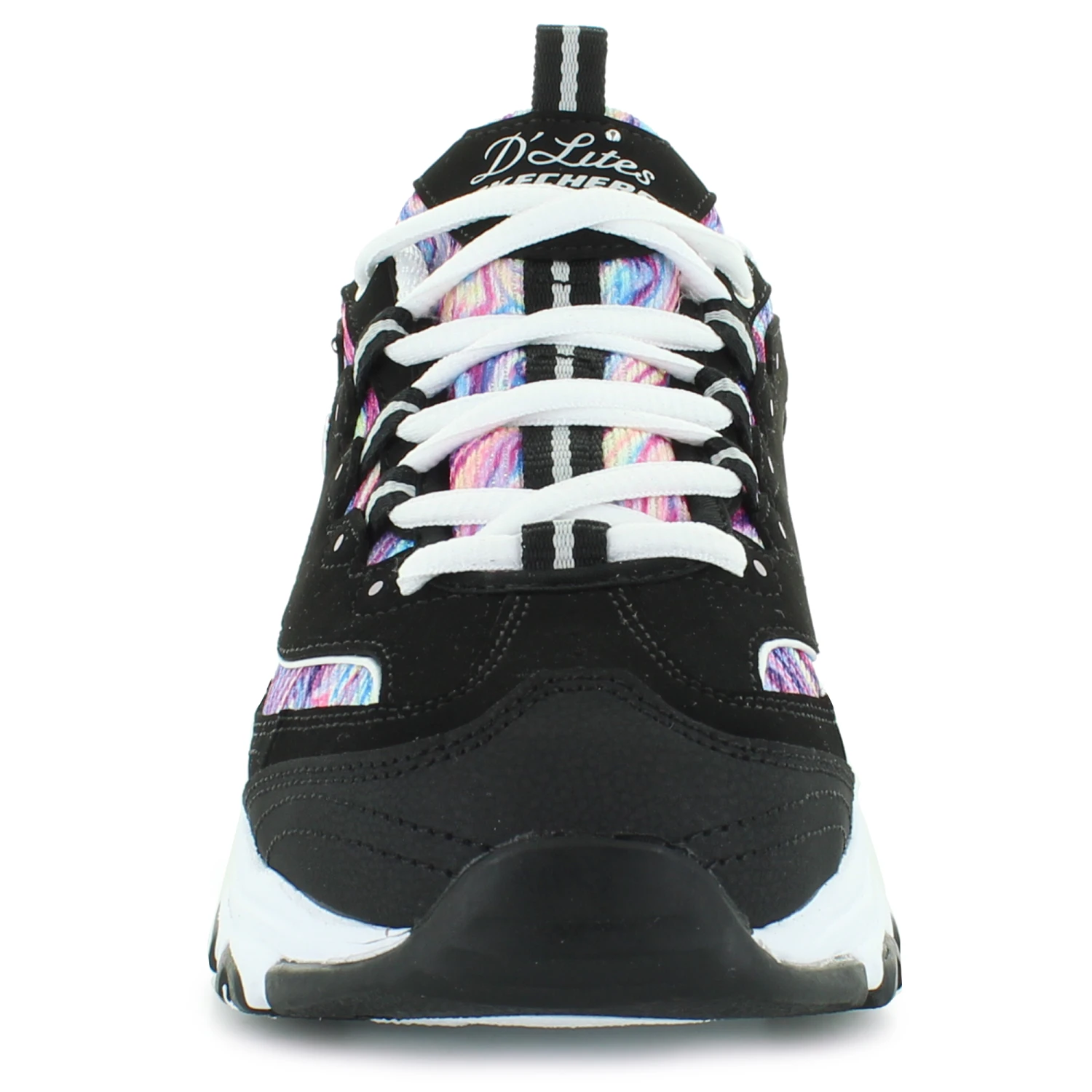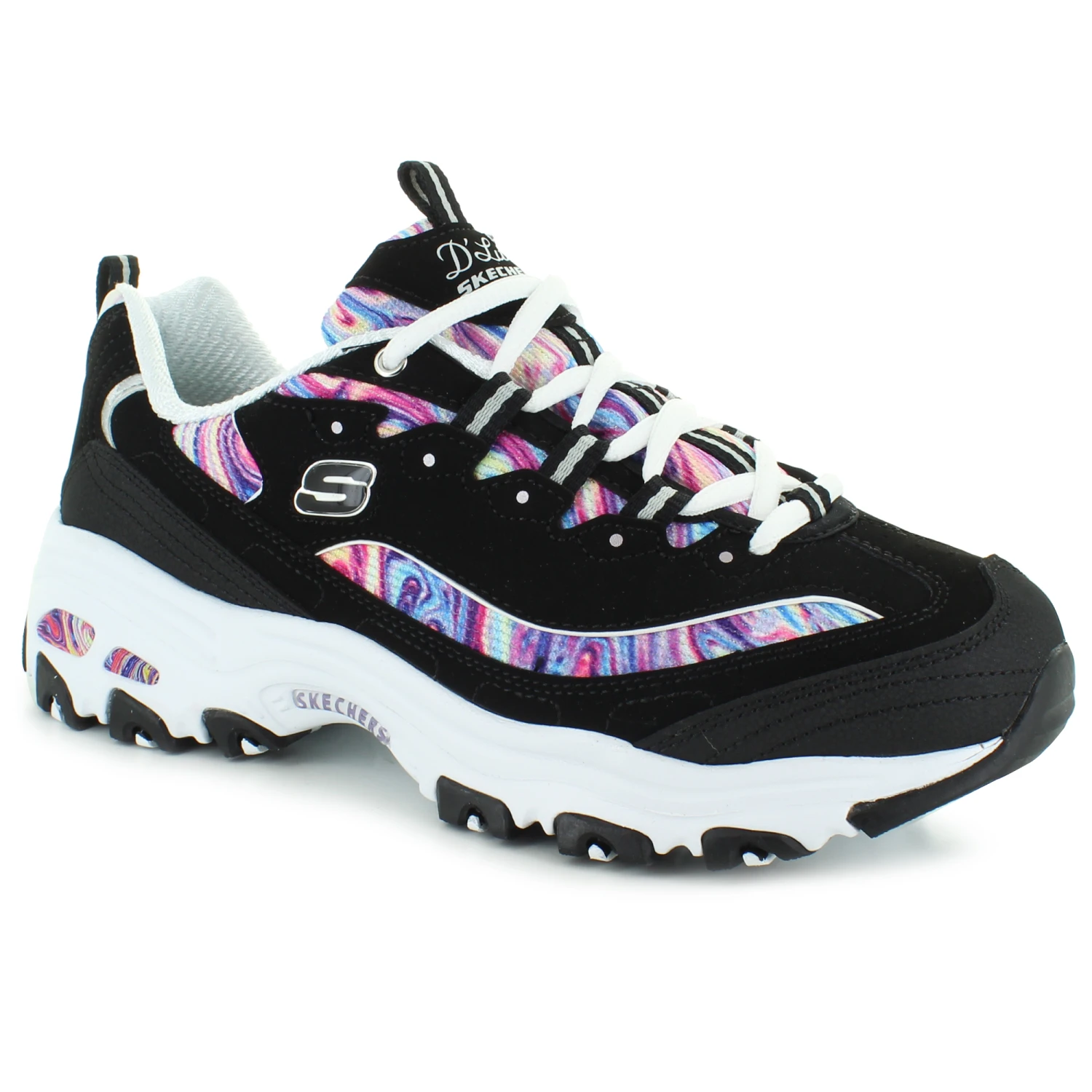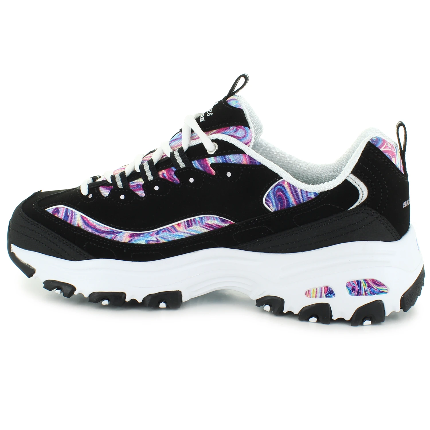 Groove in wavy style with Skechers D’lites – Whimsical Dreams. This fashion lace-up features a leather and mesh upper with an Air-Cooled Memory Foam insole and a marbled swirl print trim.