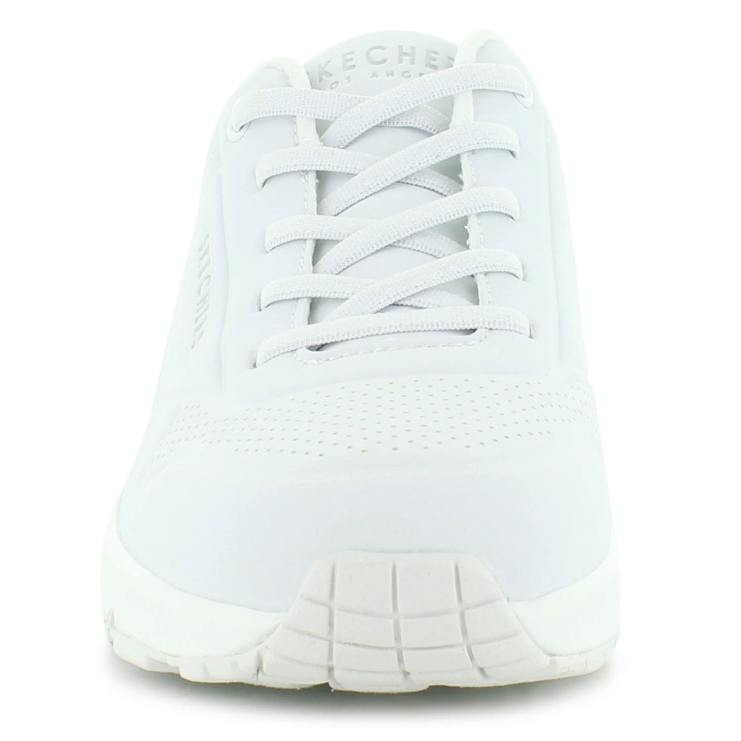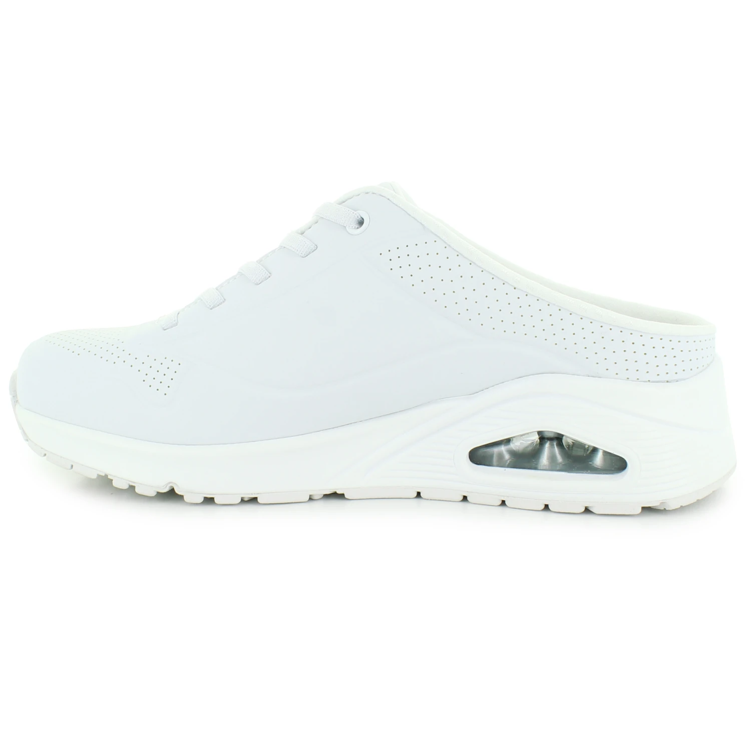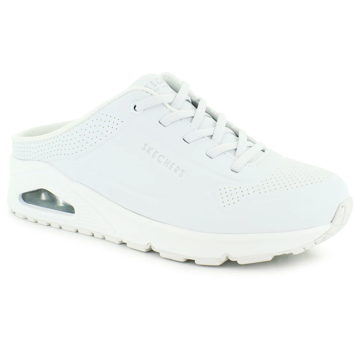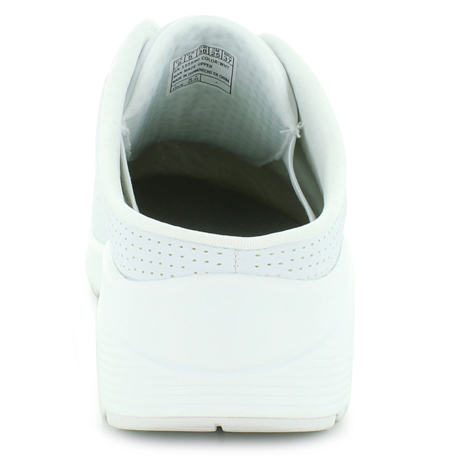 Slip on a fresh kick of stylish comfort wearing Skechers Street Uno – Open Air. This fashion sneaker mule features a synthetic durabuck and mesh upper with stretch laces, Skechers Air-Cooled Memory Foam insole, and a platform wedge with visible Skech-Air air-cushioned midsole.