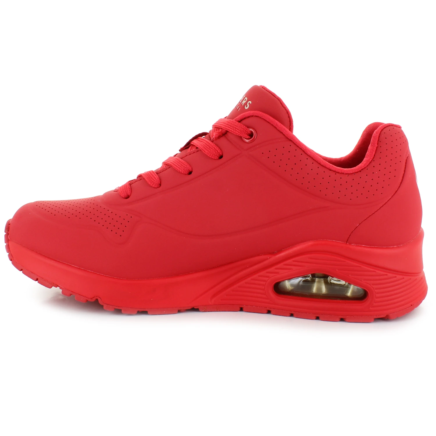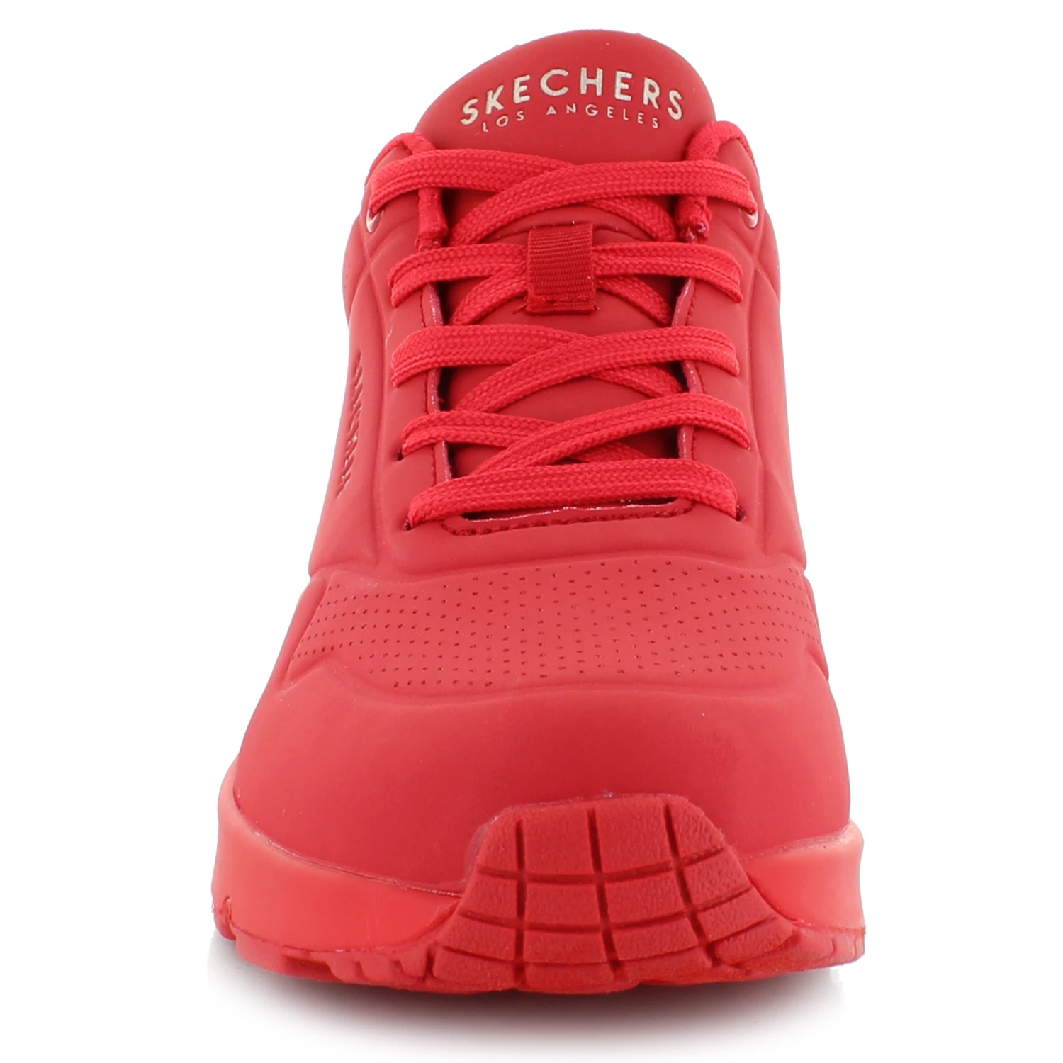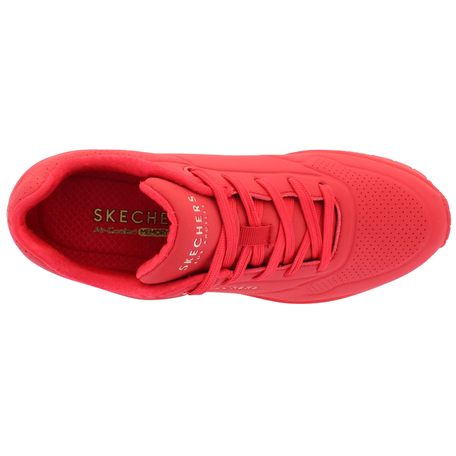 Classic air cushioned style meets updated comfort in the SKECHERS Street Uno – Stand on Air shoe. Smooth leather-textured synthetic upper in a lace up classic fashion sneaker with stitching and perforation accents. Air-Cooled Memory Foam insole, visible air cushioned midsole.