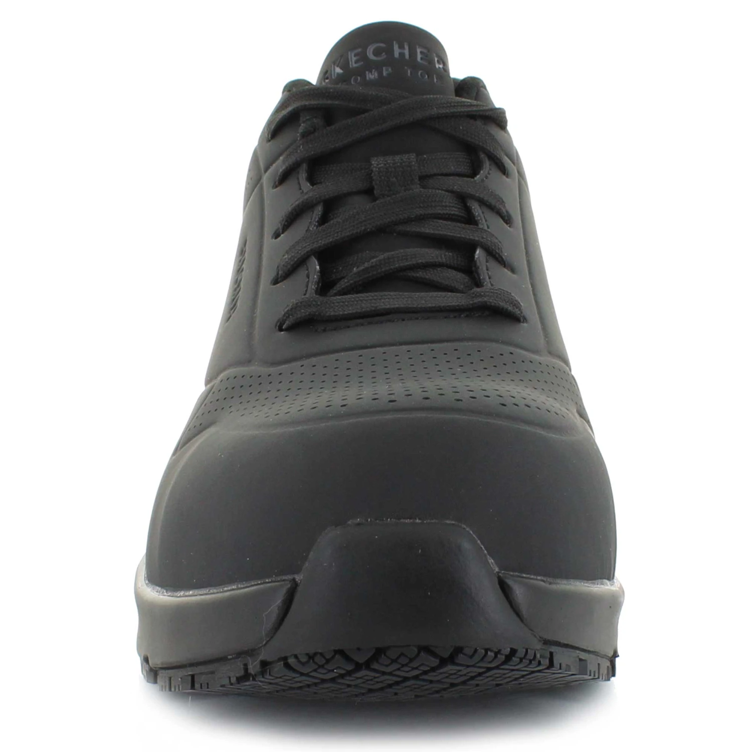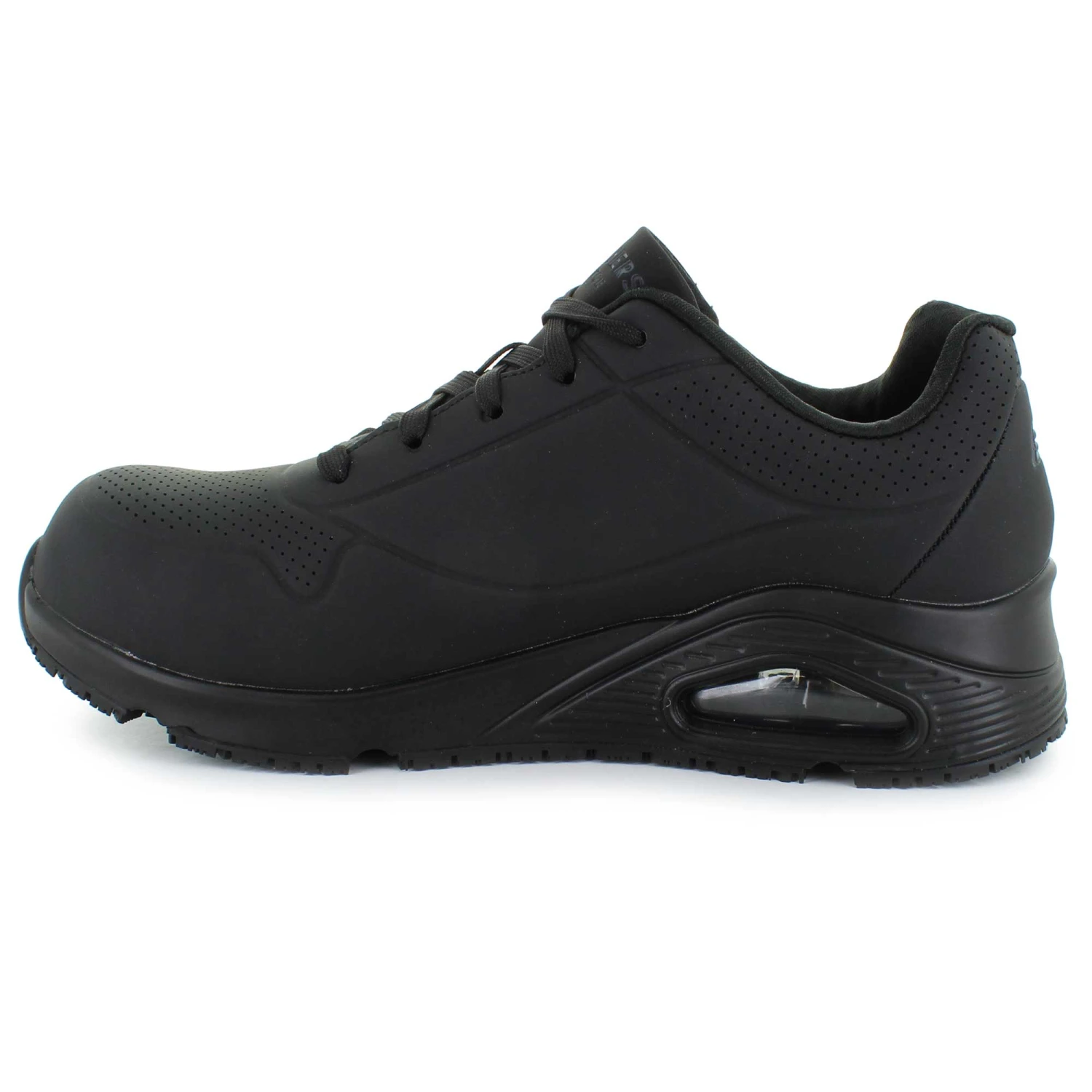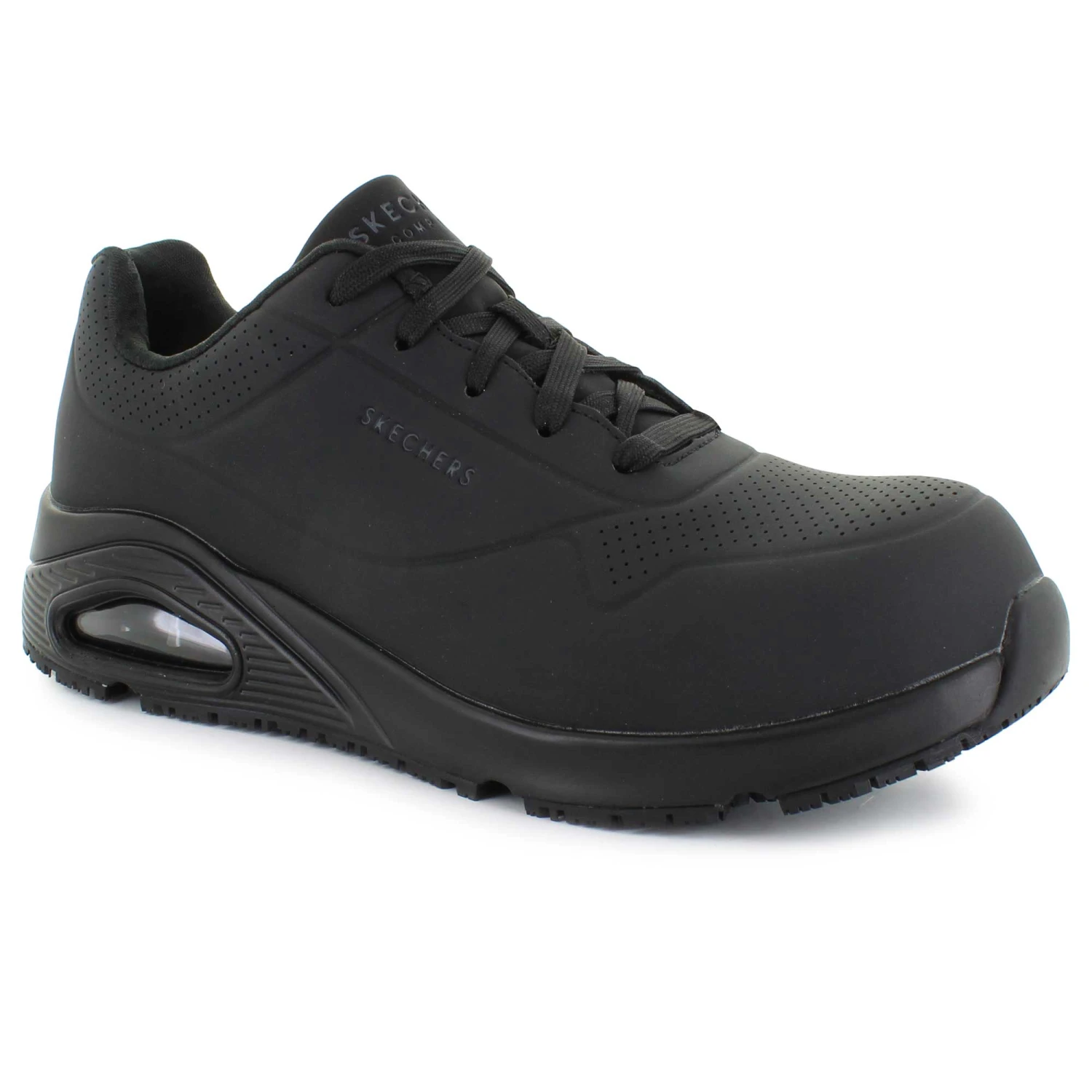 A popular work design is reinforced with added toe safety in Skechers Work: Uno SR – Deloney. This slip-resistant athletic work design features a durable perforated synthetic durabuck upper with a composite safety toe, a Skechers Air-Cooled Memory Foam insole and Skech-Air visible air-bag midsole.
